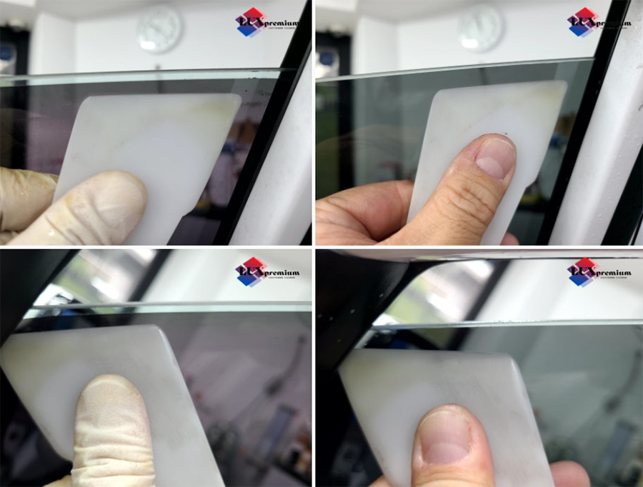 유리의 가장자리(엣지 부분)에 필름이 살짝 떠보이거나 틈이 생기는 현상을 방지하기 위한 전문적인 마감 기법입니다.