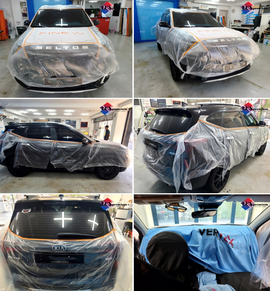 시공전 차량외부 내부에 커버링과 커버로 보양을 한후 시공을 진행하고 있습니다.
